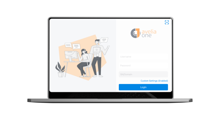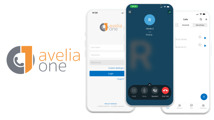 - App Avelia One (desktop e mobile): softphone per Windows, macOS, iOS e Android con funzionalità di chat, presenza, chiamate, integrazione CRM e messaggistica unificata;